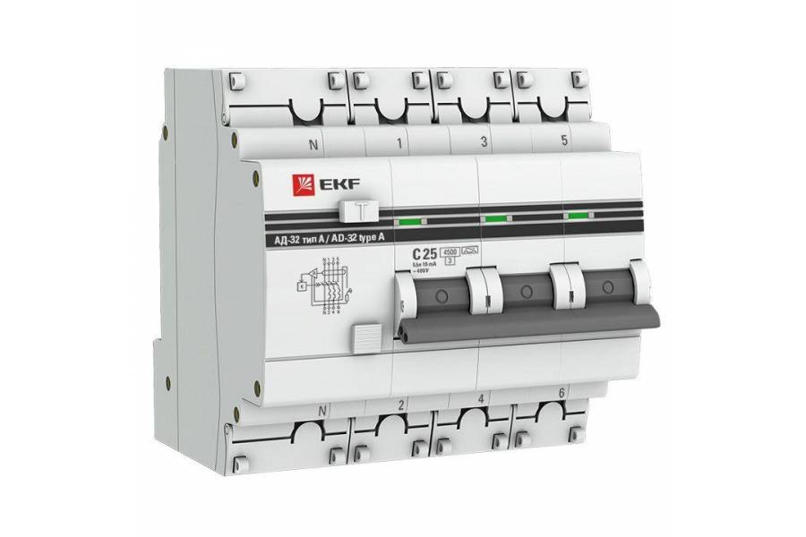 Выключатель автоматический дифференциального тока 3п+N C 63А 30мА тип AC 4.5кА АД-32 PROxima EKF DA32-63-30-4P-pro