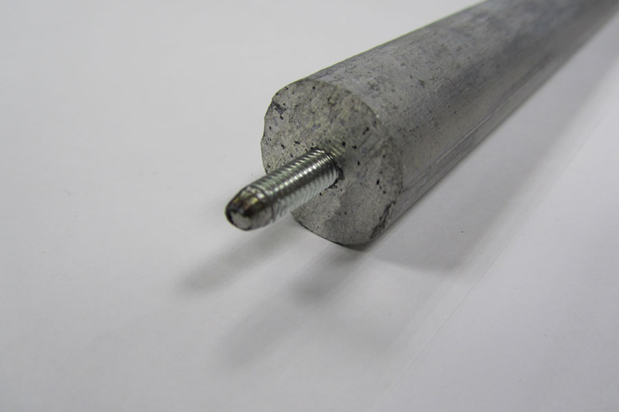 Магниевый анод избавляет от коррозии стенки бака, а так же снижает образование накипи, смягчает накипь, образующуюся на ТЭНе. Представляет собой стержень из магниевого сплава на металлической шпильке с резьбой. Анод прикручивается к фланцу ТЭНа и вставляется внутрь бака водонагревателя.