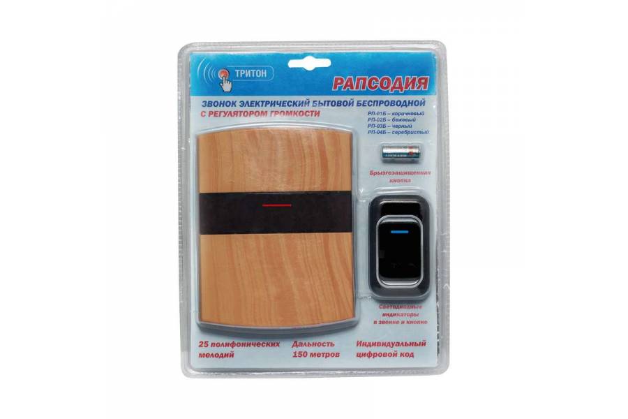 Звонок беспроводной полиф. Рапсодия 25 мел. 150м 4-тон. полифония регул. громкости брызгозащ. кнопка IP44 2ААх1.5В св. дерево Тритон РП-02Б