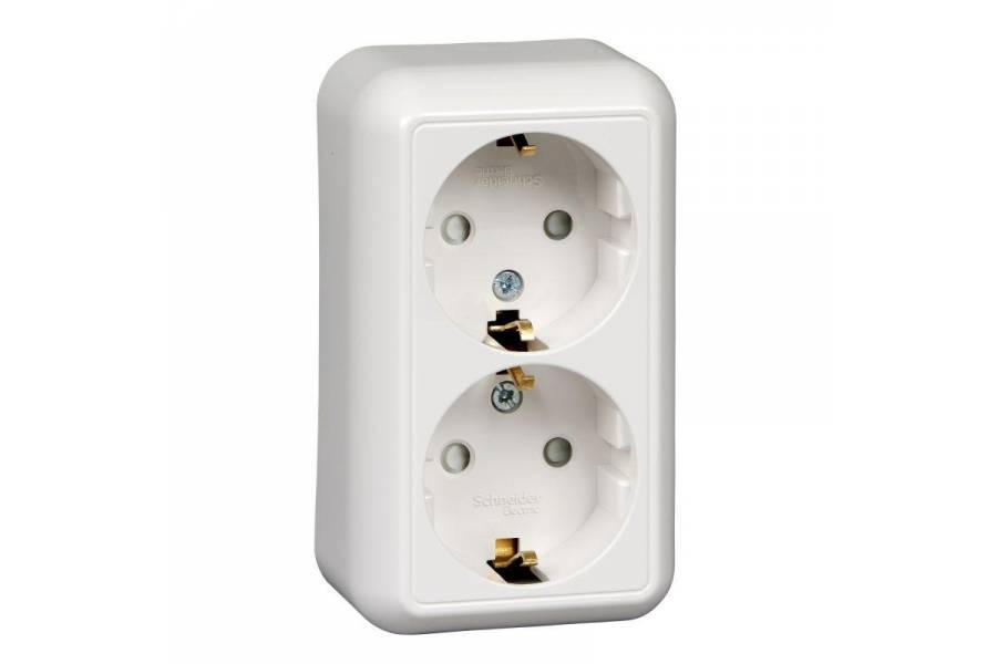 Розетка 2-м ОП Прима 16А IP20 250В с заземл. защ. шторки с монтаж. пластиной бел. (опт. упак.) SchE RA16-214M-B