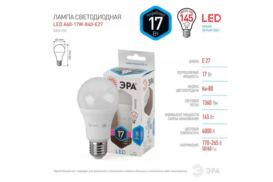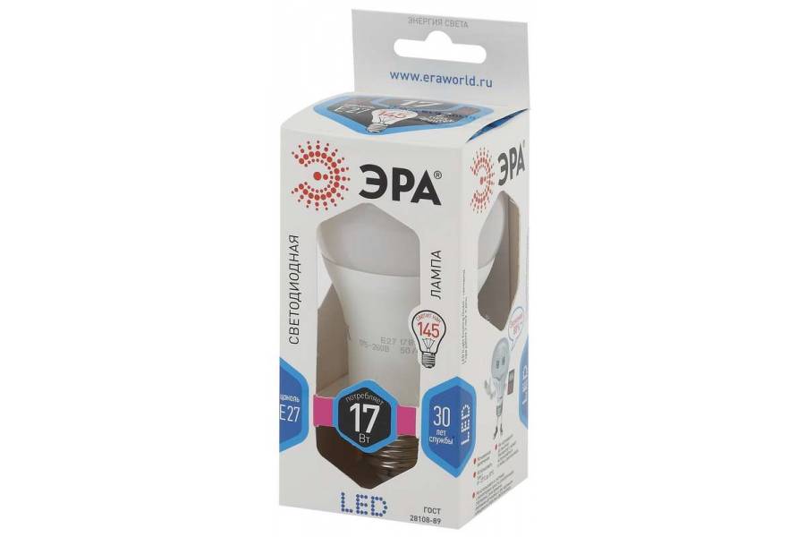 Лампа светодиодная A60-17W-840-E27 грушевидная 1360лм ЭРА Б0031700
