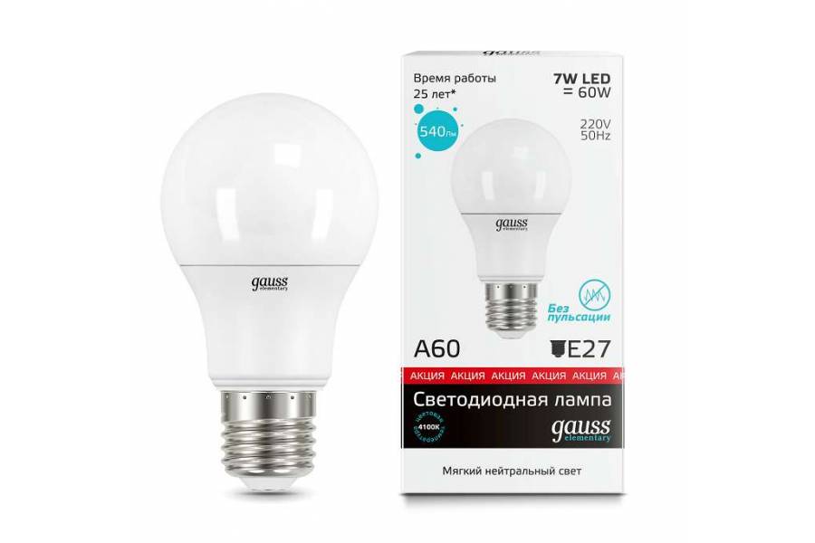 Лампа светодиодная Elementary A60 7Вт грушевидная 4100К бел. E27 540лм 180-240В Gauss 23227A