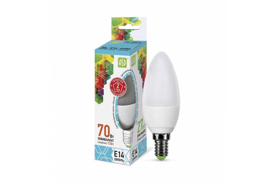 Лампа светодиодная LED-СВЕЧА-standard 7.5Вт СВЕЧА 4000К бел. E14 675лм 160-260В ASD 4690612003931