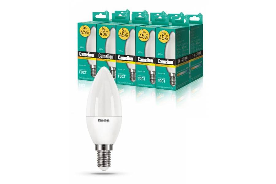 Лампа светодиодная LED5-C35/830/E14 5Вт свеча 3000К тепл. бел. E14 390лм 220-240В Camelion 12031