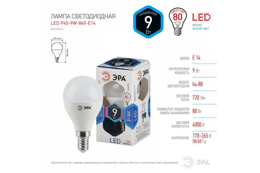 Лампа светодиодная P45-9w-840-E14 шар 720лм ЭРА Б0029042