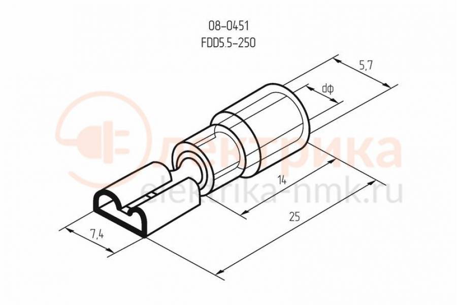 КЛЕММА ПЛОСКАЯ изолированная (КПИ гнездо - 7.4мм) 4-6мм? (FDD5.5-250, VF5.5-250) REXANT предназначена для создания качественного подключения электрооборудования или соединения проводов между собой, которое при необходимости возможно разъединить без лишних усилий. Такая клемма используется для оконцовывания многожильных медных проводов при монтаже мобильных электрических контактных соединений на подвижном составе (автомобиле-, вагоно-, самолето- и судостроении). Изолированная плоская клемма REXANT состоит из двух компонентов: металлического коннектора (гнездо) и защитного изолятора. Металлический коннектор изготовлен из латуни, с поверхностным электролитических лужением, а изолятор клеммы из поливинилхлорида (ПВХ), который надежно защищает место обжима кабеля. Обжатие производится специальными пресс-клещами (HT-301 H арт.12-3014, 12-3014; HT-301 N арт.12-3117, 12-3016, 12-3016-4; HT-301 W арт.12-3021, 12-3021-4, 12-3121) поверх защитного изолятора. Каждая клемма имеет фиксатор для более прочного механического соединения с штекерным разъемом. Цвет изолятора желтый. Основные характеристики: