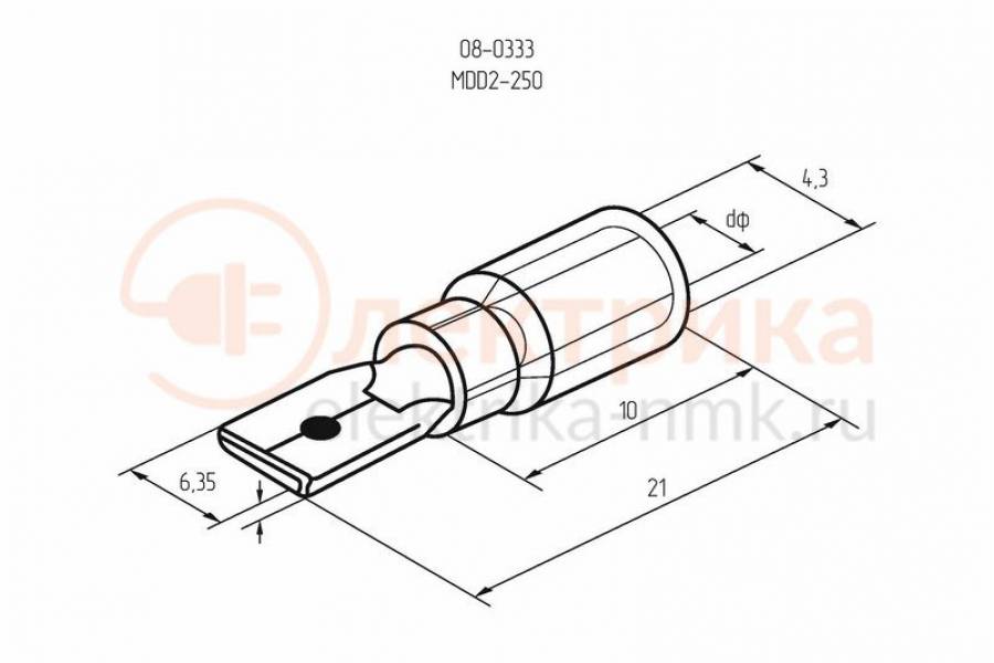 КЛЕММА ПЛОСКАЯ изолированная (КПИ штекер - 6.3мм) 1.5-2.5мм? (MDD2-250, VM2-250) REXANT предназначена для создания качественного подключения электрооборудования или соединения проводов между собой, которое при необходимости возможно разъединить без лишних усилий. Такая клемма используется для оконцовывания многожильных медных проводов при монтаже мобильных электрических контактных соединений на подвижном составе (автомобиле-, вагоно-, самолето- и судостроении). Изолированная плоская клемма REXANT состоит из двух компонентов: металлического коннектора (штекер) и защитного изолятора. Металлический коннектор изготовлен из латуни, с поверхностным электролитических лужением, а изолятор клеммы из поливинилхлорида (ПВХ), который надежно защищает место обжима кабеля. Обжатие производится специальными пресс-клещами (HT-301 H арт.12-3014, 12-3014; HT-301 N арт.12-3116, 12-3117, 12-3016, 12-3016-4; HT-301 W арт.12-3021, 12-3021-4, 12-3121) поверх защитного изолятора. Каждая клемма имеет отверстие, служащее фиксатором замкового типа для более прочного механического соединения с гнездовым разъемом. Цвет изолятора синий. Основные характеристики: