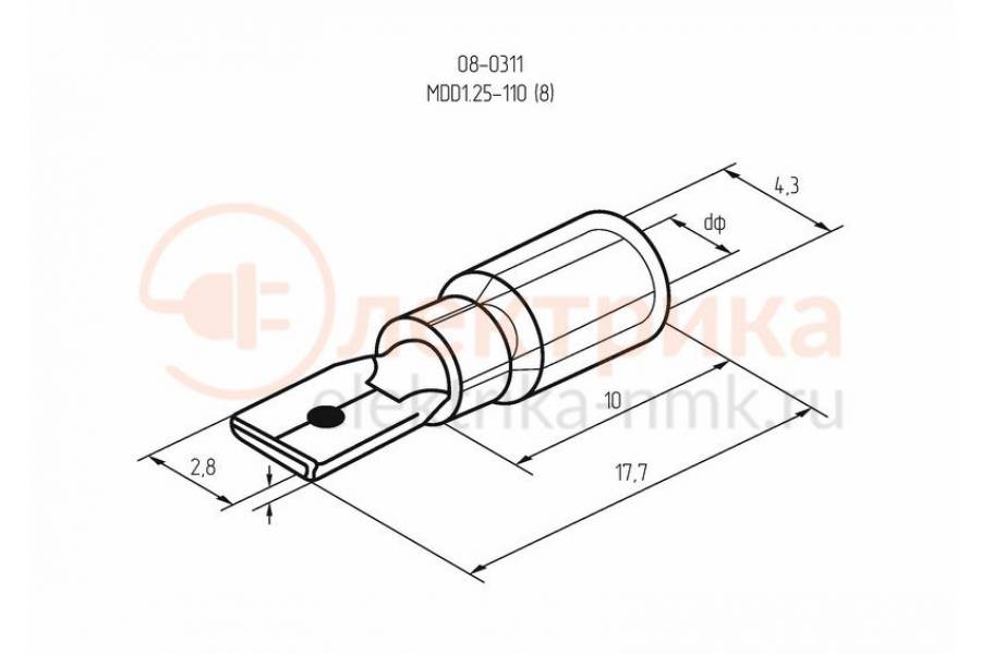 КЛЕММА ПЛОСКАЯ изолированная (КПИ штекер - 2.8мм) 0.5-1.5мм? (VM1.25-110(8)) REXANT предназначена для создания качественного подключения электрооборудования или соединения проводов между собой, которое при необходимости возможно разъединить без лишних усилий. Такая клемма используется для оконцовывания многожильных медных проводов при монтаже мобильных электрических контактных соединений на подвижном составе (автомобиле-, вагоно-, самолето- и судостроении). Изолированная плоская клемма REXANT состоит из двух компонентов: металлического коннектора (штекер) и защитного изолятора. Металлический коннектор изготовлен из латуни, с поверхностным электролитических лужением, а изолятор клеммы из поливинилхлорида (ПВХ), который надежно защищает место обжима кабеля. Обжатие производится специальными пресс-клещами (HT-301 H арт.12-3014, 12-3014; HT-301 N арт.12-3116; HT-301 W арт.12-3021, 12-3021-4) поверх защитного изолятора. Каждая клемма имеет отверстие, служащее фиксатором замкового типа для более прочного механического соединения с гнездовым разъемом. Цвет изолятора красный. Основные характеристики: