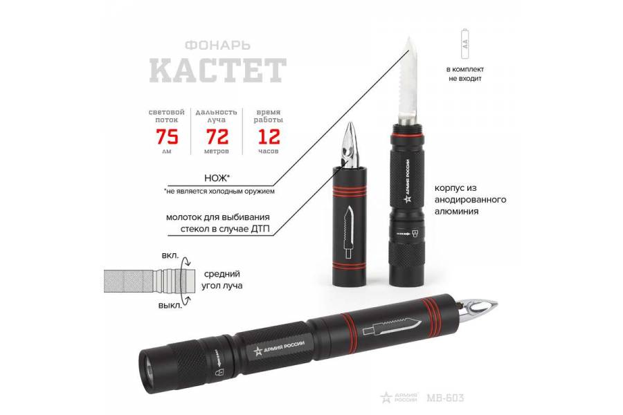 Фонарь MB-603 АРМИЯ РОССИИ универс. Кастет 1.5Вт алюм. нож; молоток 1хАА блист. ЭРА Б0030196